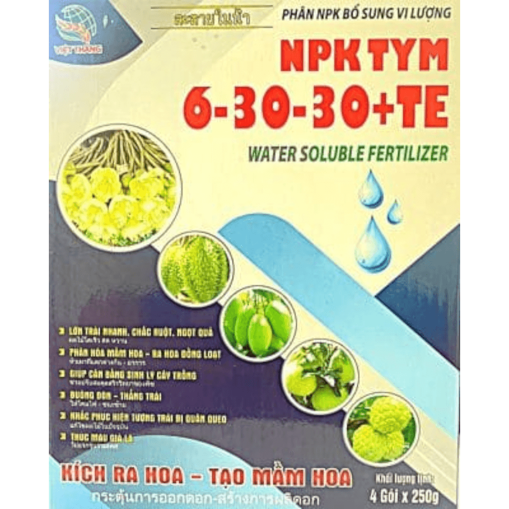 NPK TYM 6-30-30+TE là phân bón cao cấp hòa tan hoàn toàn trong nước, chuyên dùng để kích thích ra hoa, tạo mầm hoa, dưỡng trái chắc ngọt và bóng đẹp.
